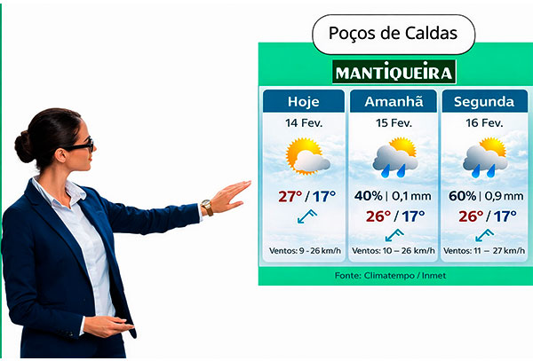 Bom dia Poços de Caldas – Hoje, 14 de fevereiro, a cidade amanheceu com céu nublado sem previsão de chuvas. A manhã começou com 17ºC e, ao longo do dia, a temperatura máxima prevista será de 27ºC. A umidade relativa do ar se manterá em torno de 74%.