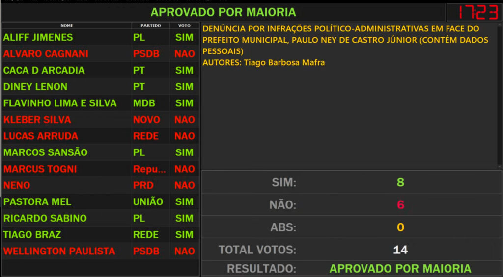 Votaram a favor da denúncia os vereadores Aliff Gimenez (PL), Cacá D´Arcária (PT), Diney Lenon (PT), Flavinho (MDB), Marcos Sansão (PL), Pastora Mel (União), Ricardo Sabino (PL) e Tiago Braz (Rede). Votaram contra os vereadores Álvaro Cagnani (PSDB), Kleber Silva (Novo), Lucas Arruda (Rede), Marcus Togni (Repuclicanos), Neno (PRD) e Wellington Paulista (PSDB).
