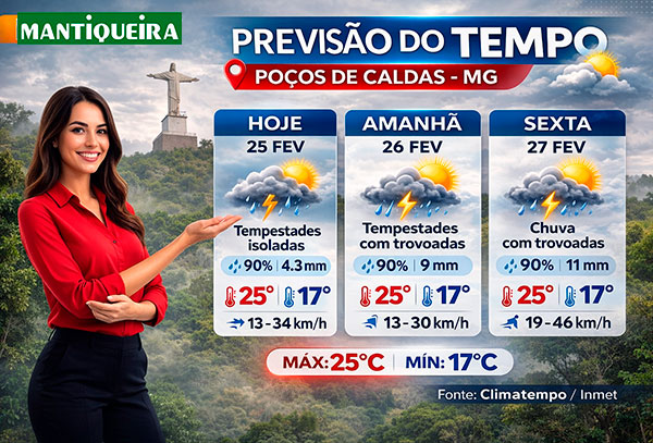 Bom dia Poços de Caldas – Hoje, 25 de fevereiro, a cidade amanheceu com céu nublado com previsão de chuvas isoladas. A manhã começou com 17ºC e, ao longo do dia, a temperatura máxima prevista será de 24ºC. A umidade relativa do ar se manterá em torno de 92%.