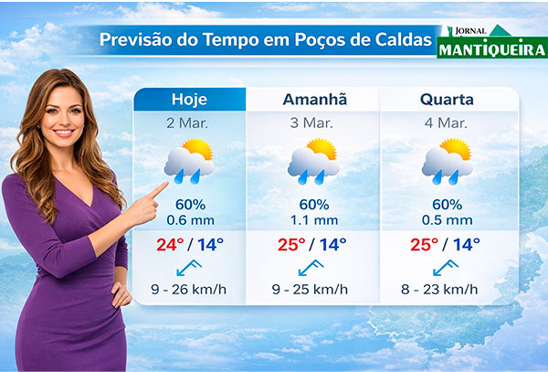 Bom dia Poços de Caldas – Hoje, 02 de março, a cidade amanheceu com céu parcialmente nublado com previsão de chuvas fracas e isoladas. A manhã começou com 14ºC e, ao longo do dia, a temperatura máxima prevista será de 24ºC. A umidade relativa do ar se manterá em torno de 77%.