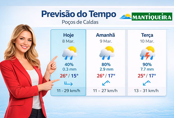 Bom dia, Poços de Caldas – Hoje, 08 de março, a cidade amanheceu com céu parcialmente nublado com previsão de chuvas isoladas. A manhã começou com 15ºC e, ao longo do dia, a temperatura máxima prevista será de 26ºC. A umidade relativa do ar se manterá em torno de 78%.