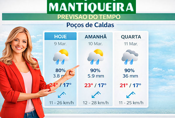 Bom dia, Poços de Caldas – Hoje, 09 de março, a cidade amanheceu com céu nublado com previsão de chuvas isoladas. A manhã começou com 17ºC e, ao longo do dia, a temperatura máxima prevista será de 24ºC. A umidade relativa do ar se manterá em torno de 88%.