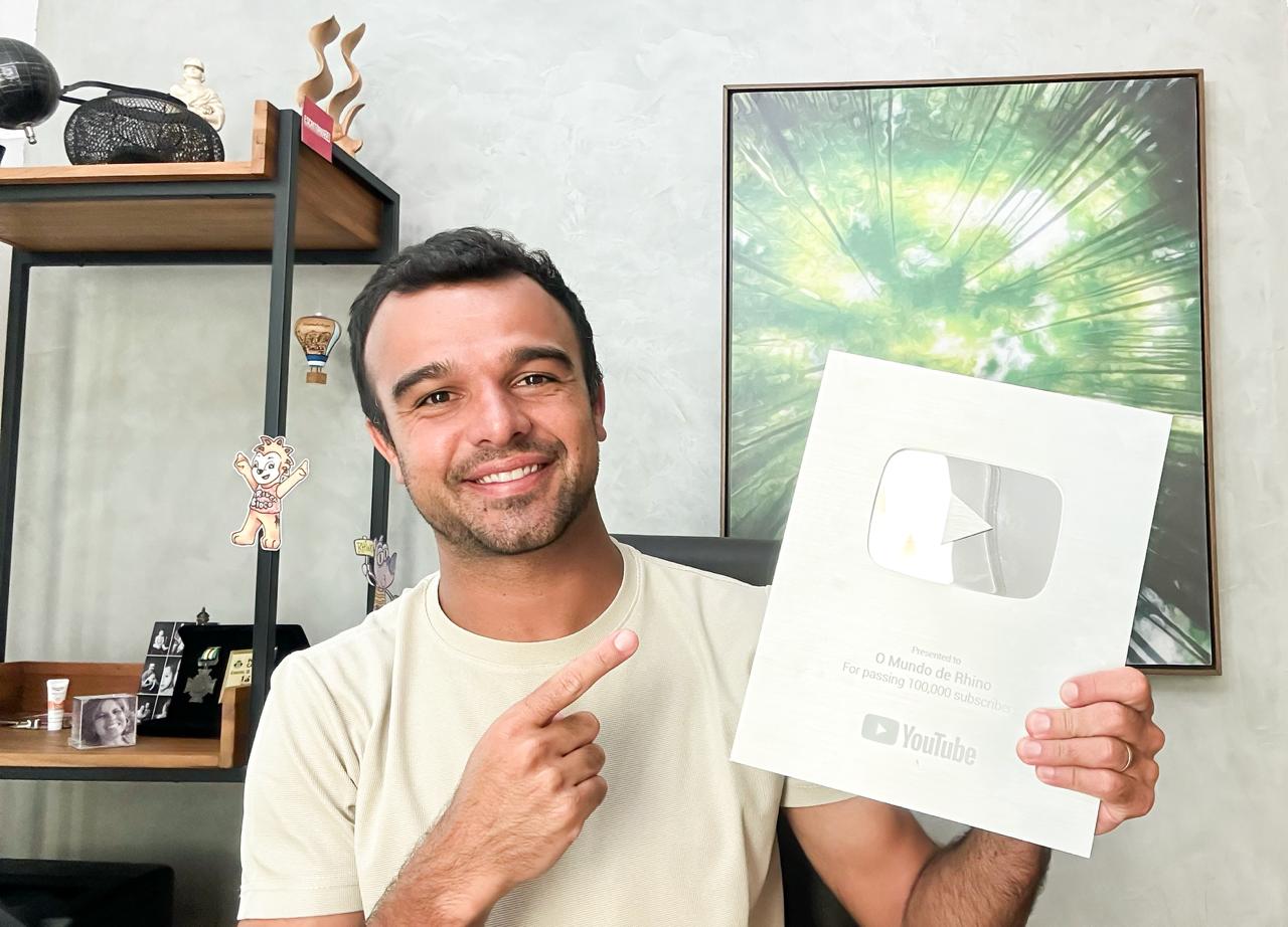 Poços de Caldas, MG – O produtor, escritor e YouTuber Marco Noronha, de Poços, acaba de alcançar um marco expressivo no cenário digital infantil: a conquista da placa de prata do YouTube, premiação concedida a canais que ultrapassam a marca de 100 mil inscritos. O reconhecimento veio através do canal “O Mundo de Rhino”, projeto que vem ganhando espaço entre famílias de todo o Brasil.