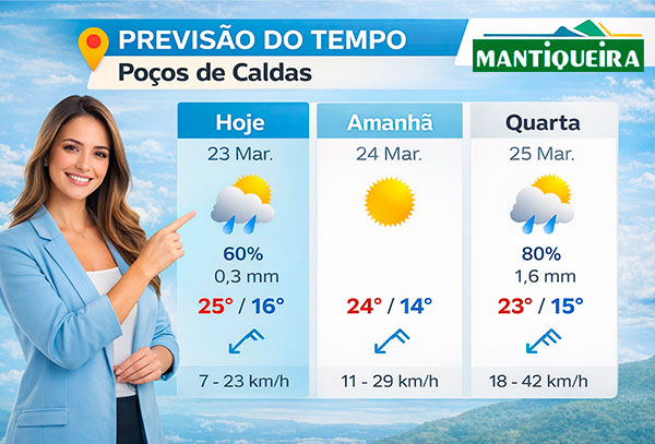 Bom dia, Poços de Caldas – Hoje, 23 de março, a cidade amanheceu com céu claro sem previsão de chuvas. A manhã começou com 16ºC e, ao longo do dia, a temperatura máxima prevista será de 25ºC. A umidade relativa do ar se manterá em torno de 73%.