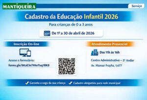 Devem ser cadastradas crianças de 0 a 3 anos que desejam ingressar na Educação Infantil da Rede Municipal de Ensino e também aquelas que completam 4 anos após 31 de março, contemplando vagas para Berçário I e II e Maternal I e II. Gestantes também já podem realizar o cadastro.
