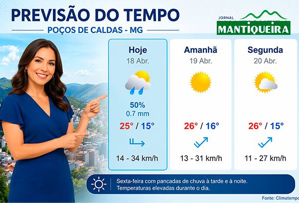 Bom dia, Poços de Caldas – Hoje, 18 de abril, a cidade amanheceu com céu parcialmente nublado com previsão de chuvas isoladas. A manhã começou com 15ºC e, ao longo do dia, a temperatura máxima prevista será de 25ºC. A umidade relativa do ar se manterá em torno de 71%.
