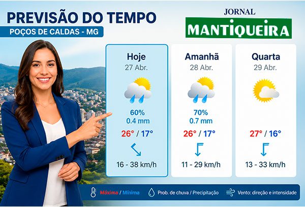 Bom dia, Poços de Caldas – Hoje, 27 de abril, a cidade amanheceu com céu parcialmente nublado com previsão de chuvas fracas. A manhã começou com 17ºC e, ao longo do dia, a temperatura máxima prevista será de 26ºC. A umidade relativa do ar se manterá em torno de 67%.