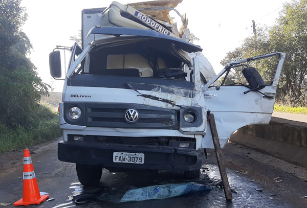 Caminhão perde controle e colide com mureta na MG-1545; motorista ficou preso às ferragens